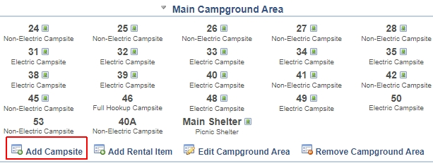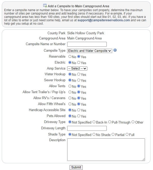 | Table of Contents Quick Start Guide Campgrounds / Parks Campground Admins Campground Employees Campground Information Campground Areas Campsite Types Campsites Rental Item Types Rental Items Amenities Documents & Files Location Information Photos Store Items Orders Reservations Adding Reservations Editing Reservations Cancellations Campground Calendar Weekly Payouts Refunds Reports Reservation Settings Reservation System Plugin Search Orders Campsite Rates Rental Rates Tax Rates Discounts Holidays Block Off Resources Customer Service | Campsites Adding Campsites Campsites are areas that customers and campers can stay overnight and are a key component to all campgrounds. Before campground admins can add campsites to their campground, be sure to first add any neccessary Campsite Types. Once Campsite Types have been entered, campground admins can start adding campsites from either the Campground page or any of the Campground Area pages. Click on the 'Add Campsite' link. ![]() To add a campsite, first enter a campsite name or number. In order for sites to sort correctly, you may want to place leading zeroes. For example; 01 instead of just 1. Select any other options that will best describe the new campsite such as electric availability and what type of sleeping units it can handle. Near the bottom, there is also a place to enter a campsite description for customers to see. ![]() |