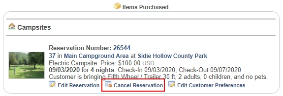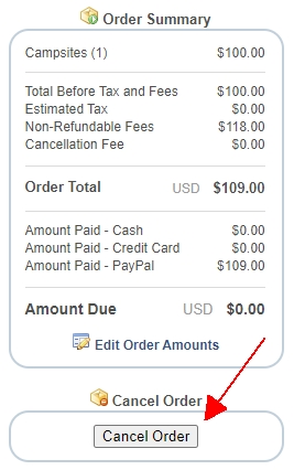 | Table of Contents Quick Start Guide Campgrounds / Parks Campground Admins Campground Employees Campground Information Campground Areas Campsite Types Campsites Rental Item Types Rental Items Amenities Documents & Files Location Information Photos Store Items Orders Reservations Adding Reservations Editing Reservations Cancellations Campground Calendar Weekly Payouts Refunds Reports Reservation Settings Reservation System Plugin Search Orders Campsite Rates Rental Rates Tax Rates Discounts Holidays Block Off Resources Customer Service | Cancellations Campground admins and employees can cancel reservations and orders. Customers can cancel reservations and orders online if the campground enables this option. This can be configured in the reservation settings. To update this option, click on 'Reservation Settings' under the Campgrounds menu. ![]() If this option is disabled, customers will be instructed to contact the campground directly to cancel their reservation. ![]() Reservations can be cancelled from the reservations page. ![]() Orders can be cancelled from the orders page. ![]() |