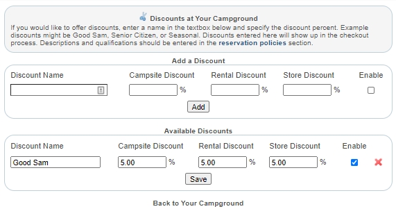 | Table of Contents Quick Start Guide Campgrounds / Parks Campground Admins Campground Employees Campground Information Campground Areas Campsite Types Campsites Rental Item Types Rental Items Amenities Documents & Files Location Information Photos Store Items Orders Reservations Adding Reservations Editing Reservations Cancellations Campground Calendar Weekly Payouts Refunds Reports Reservation Settings Reservation System Plugin Search Orders Campsite Rates Rental Rates Tax Rates Discounts Holidays Block Off Resources Customer Service | Discounts Discounts can be entered into the system and made available for customers. Some discount ideas might include senior citizen, or Good Sam. ![]() Add & Edit Discounts To add a discount option, enter in a discount name, campsite discount, rental item discount, store item discount, and whether to enable the discount or not. You can always come to this page to toggle turning discounts on or off. To remove a discount, click the red x on the right. ![]() Using Discounts Available discounts will show up for customers during the checkout process. They can choose to apply a discount to their order. ![]() |