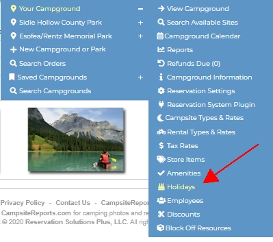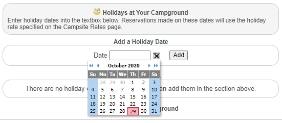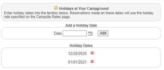 | Table of Contents Quick Start Guide Campgrounds / Parks Campground Admins Campground Employees Campground Information Campground Areas Campsite Types Campsites Rental Item Types Rental Items Amenities Documents & Files Location Information Photos Store Items Orders Reservations Adding Reservations Editing Reservations Cancellations Campground Calendar Weekly Payouts Refunds Reports Reservation Settings Reservation System Plugin Search Orders Campsite Rates Rental Rates Tax Rates Discounts Holidays Block Off Resources Customer Service | Holidays On the Holiday's page, enter in holiday dates that you would like to be used for holiday rates. Holiday rates can be entered on the Campsite Types & Rates and Rental Types & Rates pages. Access the Holidays page by clicking on 'Holidays' from the Campgrounds menu. ![]() Add Holidays Use the calendar to select a date, or simply enter a date into the input box in the MM/DD/YYYY format. ![]() Edit Holidays Holiday dates can be removed by clicking the red x next to the date and confirming the delete request. ![]() |