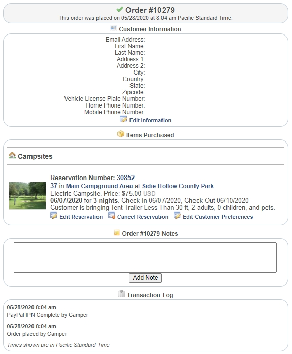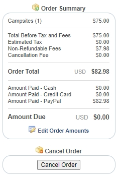 | Table of Contents Quick Start Guide Campgrounds / Parks Campground Admins Campground Employees Campground Information Campground Areas Campsite Types Campsites Rental Item Types Rental Items Amenities Documents & Files Location Information Photos Store Items Orders Reservations Adding Reservations Editing Reservations Cancellations Campground Calendar Weekly Payouts Refunds Reports Reservation Settings Reservation System Plugin Search Orders Campsite Rates Rental Rates Tax Rates Discounts Holidays Block Off Resources Customer Service | Orders Orders are a way of grouping reservations and receipts into a transaction. Orders can be placed by customers and campgrounds. CampsiteReservations.com uses a shopping cart based system.