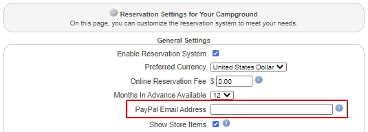 | Table of Contents Quick Start Guide Campgrounds / Parks Campground Admins Campground Employees Campground Information Campground Areas Campsite Types Campsites Rental Item Types Rental Items Amenities Documents & Files Location Information Photos Store Items Orders Reservations Adding Reservations Editing Reservations Cancellations Campground Calendar Weekly Payouts Refunds Reports Reservation Settings Reservation System Plugin Search Orders Campsite Rates Rental Rates Tax Rates Discounts Holidays Block Off Resources Customer Service | Weekly Payouts Payments are sent to campgrounds weekly on Monday's for any sales revenue incurred over the previous week. Payments are sent using PayPal to the email address of the primary campground admin (the account that created the campground). However, this can be changed by specifying a different PayPal email address in the Reservation Settings area. To do this, select 'Reservation Settings' from the campgrounds menu. ![]() On the Reservation Settings page, enter in an email address in the 'PayPal Email Address' input box of where you would like payments to be sent. This will be the new default for payments being sent to the campground. ![]() |